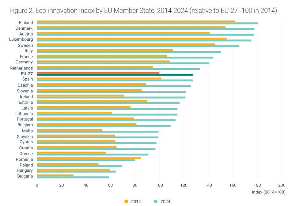 Slovensko zaostáva aj v oblasti zavádzania obnoviteľných zdrojov energií. Napriek bohatým prírodným zdrojom podiel obnoviteľných energií na celkovej spotrebe patrí medzi najnižšie v EÚ. Graf nižšie od Európskej environmentálnej agentúry zobrazuje umiestnenie Slovenska z hľadiska ekologickej inovácie za poslednú dekádu.