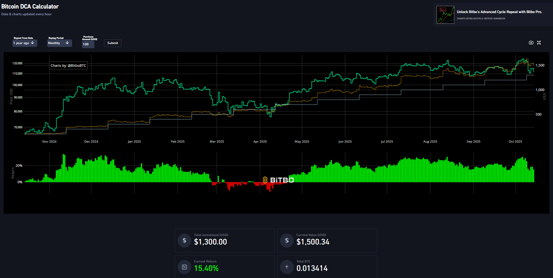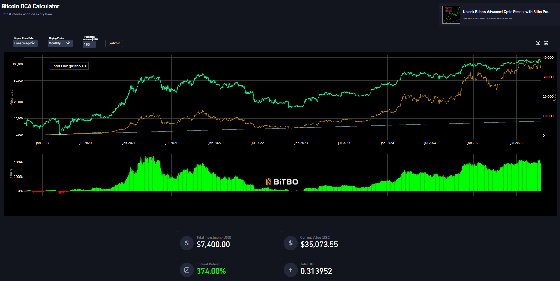 Investícia 100 eur mesačne do Bitcoinu podľa údajov z online kalkulačky Bitbo priniesla za posledných 6 rokov zhodnotenie 374 %. To znamená, že ak by ste počas tohto obdobia investovali pravidelne, váš celkový vklad by dosiahol 7 400 eur, zatiaľ čo hodnota účtu by predstavovala 35 073,55 eur.
