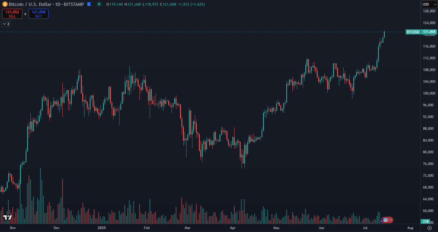 Bitcoin zaznamenal dramatický rast a po prvý raz v histórii prekonal hranicu 120 000 dolárov, ukazujú údaje TradingView. ide o reakciu trhu na niekoľko kľúčových udalostí vrátane legislatívnych zmien a verejných vyhlásení významných osobností, ako je Donald Trump.