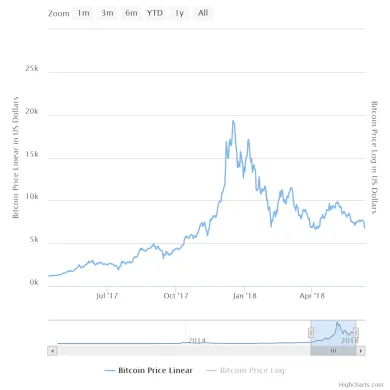 Maximum Bitcoinu v roku 2018 bol 7. januára, keď sa obchodoval za 19.579 dolárov – podľa CoinMarketCap. To znamená, že odvtedy BTC stratil približne 66% svojej hodnoty.
