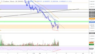 Opačnú situáciu môžeme vidieť na ADA. Silný bear trend, no túto analýzu som postol dávnejšie na Trading11, pričom trh zatiaľ dodržuje označené úrovne. Rozdiel však je, že cena padla do očakávaného oranžového pásma, ktoré znázorňuje skutočne silný support. Graf to potvrdzuje. Silnou rezistenciou je stále klesajúca trendline a vyznačené pásmo (zelené) a ďalšie rezistencie na grafe. Takisto si môžeme všimnúť narastajúce objemy. V každom prípade, ak by trh prerazil túto trendline nešlo by o bull trend, ale zatiaľ iba o korekciu v downtrende. To je potrebné si uvedomiť. Napriek tomu by trh mohol spraviť veľmi pekné percentá.