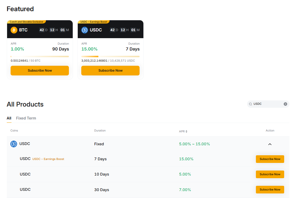 Bybit EU ponúka unikátne európske staking programy, napríklad staking USDC s ročným výnosom až 15 % pri 7-dňovom uzamknutí. Takáto príležitosť je časovo obmedzená, ale umožňuje dosiahnuť vysoký pasívny výnos s minimálnym rizikom. Okrem USDC sú k dispozícii aj stakingy populárnych tokenov ako XRP alebo SOL, ktoré ponúkajú výnos až 5,50 %.