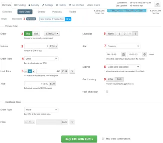 Na príklade si ukážeme ako nakúpiť jeden Ether s finančnou pákou 5:1 za cenu 442 eur, tak aby sa objednávka umiestnila na trh až o deň neskôr, o desiatej hodine.