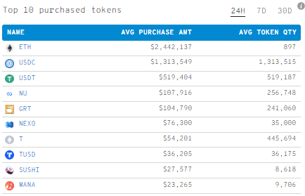 Podľa údajov portálu WhaleStats veľryby za posledné hodiny najviac nakupovali práve Ethereum, ale aj Shiba Inu, The Sandbox či Decentraland.