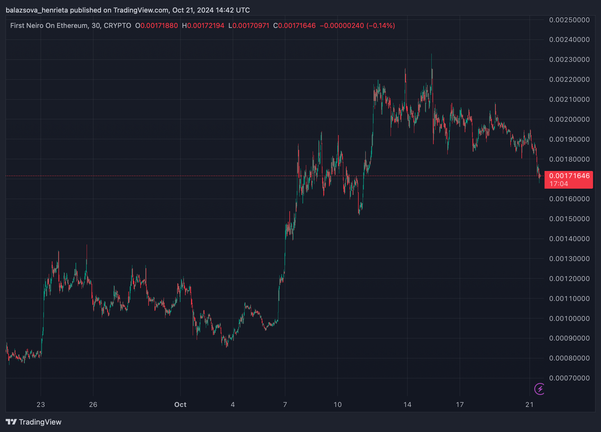 Vývoj ceny NEIRO za posledný mesiac. Zdroj: TradingView