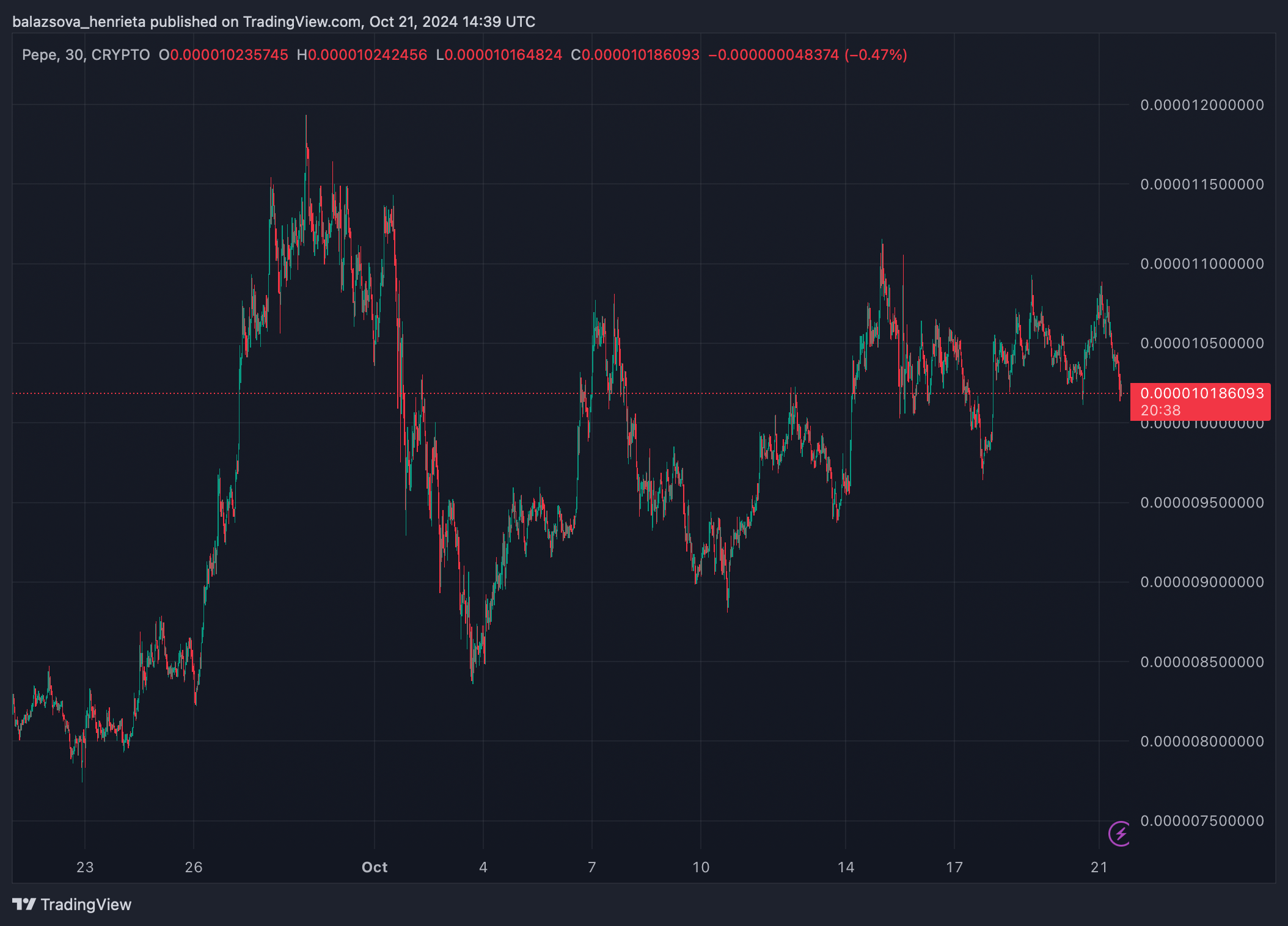 Vývoj ceny PEPE za posledný mesiac. Zdroj: TradingView