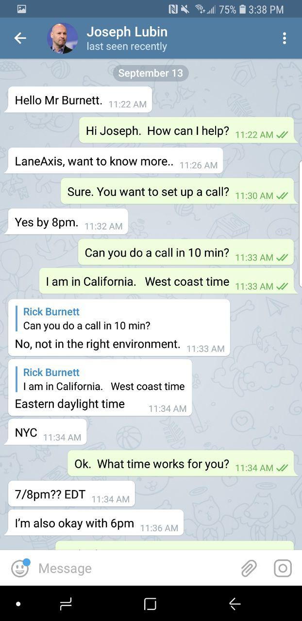 Nebolo tomu ani rok od týchto slov a identita samotného Lubina bola na internete „ukradnutá.” Dňa 13. septembra Rick Burnett, zakladateľ a CEO spoločnosti LaneAxis, dostal správu práve od Lubina prostredníctvom Telegramu v ktorej stálo: „LaneAxis: rád by som sa o vás dozvedel viac.”