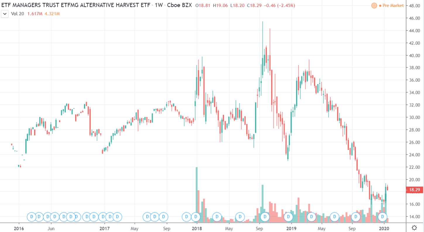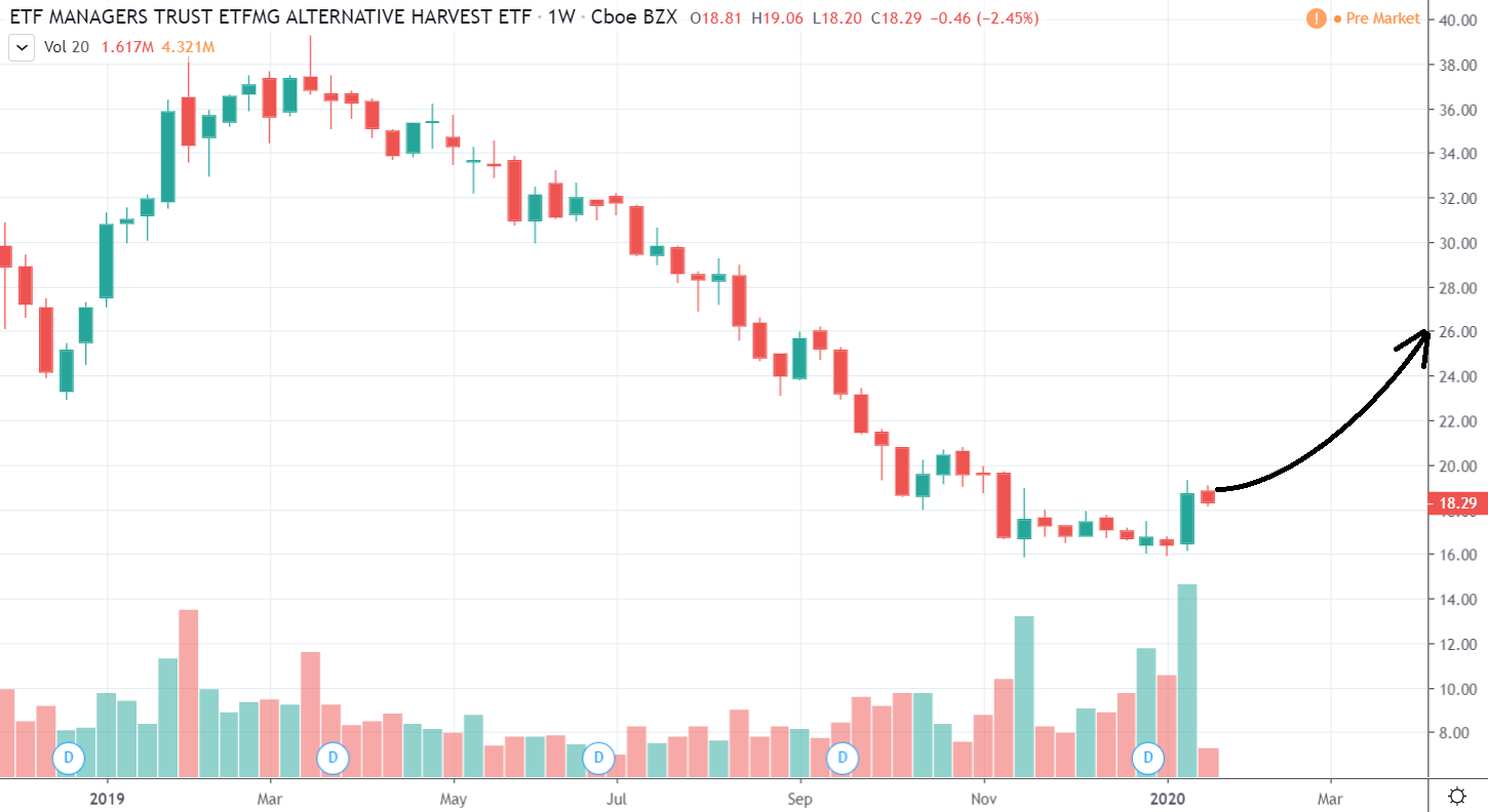 Vidieť to aj na MJ ETF (MariJuana Exchange Traded Fund – teda akýsi index marihuanového trhu), ktorý po bearmarkete v roku 2019 konečne zaznamenal ziskový týždeň. A nie iba to, prerazil dokonca aj rezistenciu formácie falling vedge.