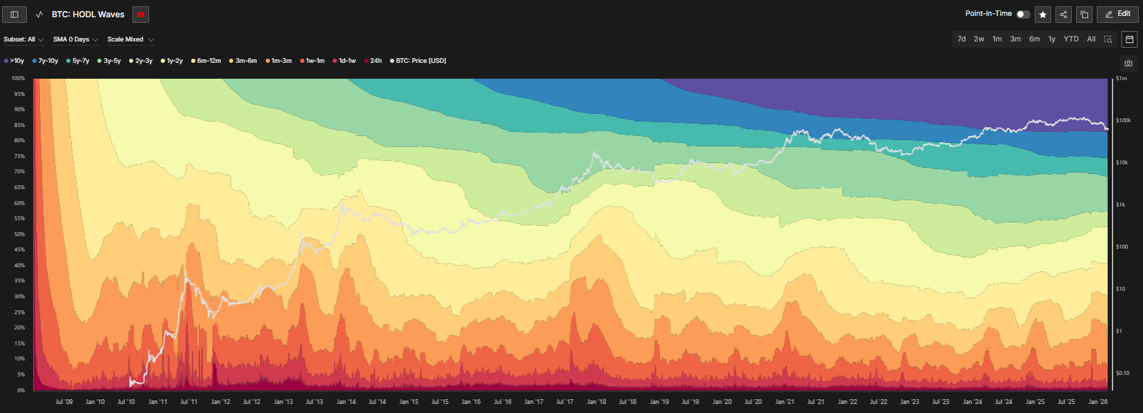 - On-chain dáta ukazujú vysoký podiel mincí neaktívnych 7 až 10 rokov.