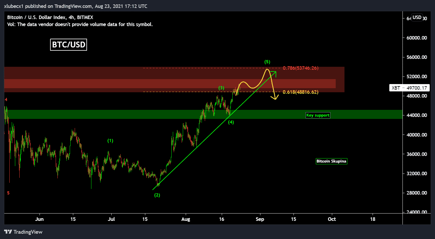 Bitcoin sa aktuálne nachádza na jednej z najsilnejších rezistencií, akú máme na grafe. Vždy v minulosti tento level zohrával dôležitú úlohu v cenovom vývoji najväčšej kryptomeny. Takmer celú jar pôsobila táto hladina ako silný support, od ktorej sa Bitcoin vždy odrazil. Už to dokonca vyzeralo tak, že Bitcoin sa nikdy pod tento level nedostane. Potom ale prišiel break out a okamžitý pokles. Presne niečo podobné sa môže stať aj teraz. Z rezistencie sa stal support a Bitcoin môže mať niekoľko mesiacov problém s touto hladinou. Následný break out pohyb však môže mať rovnaký charakter veľkého pohybu a okamžitého rastu na nové ATH.