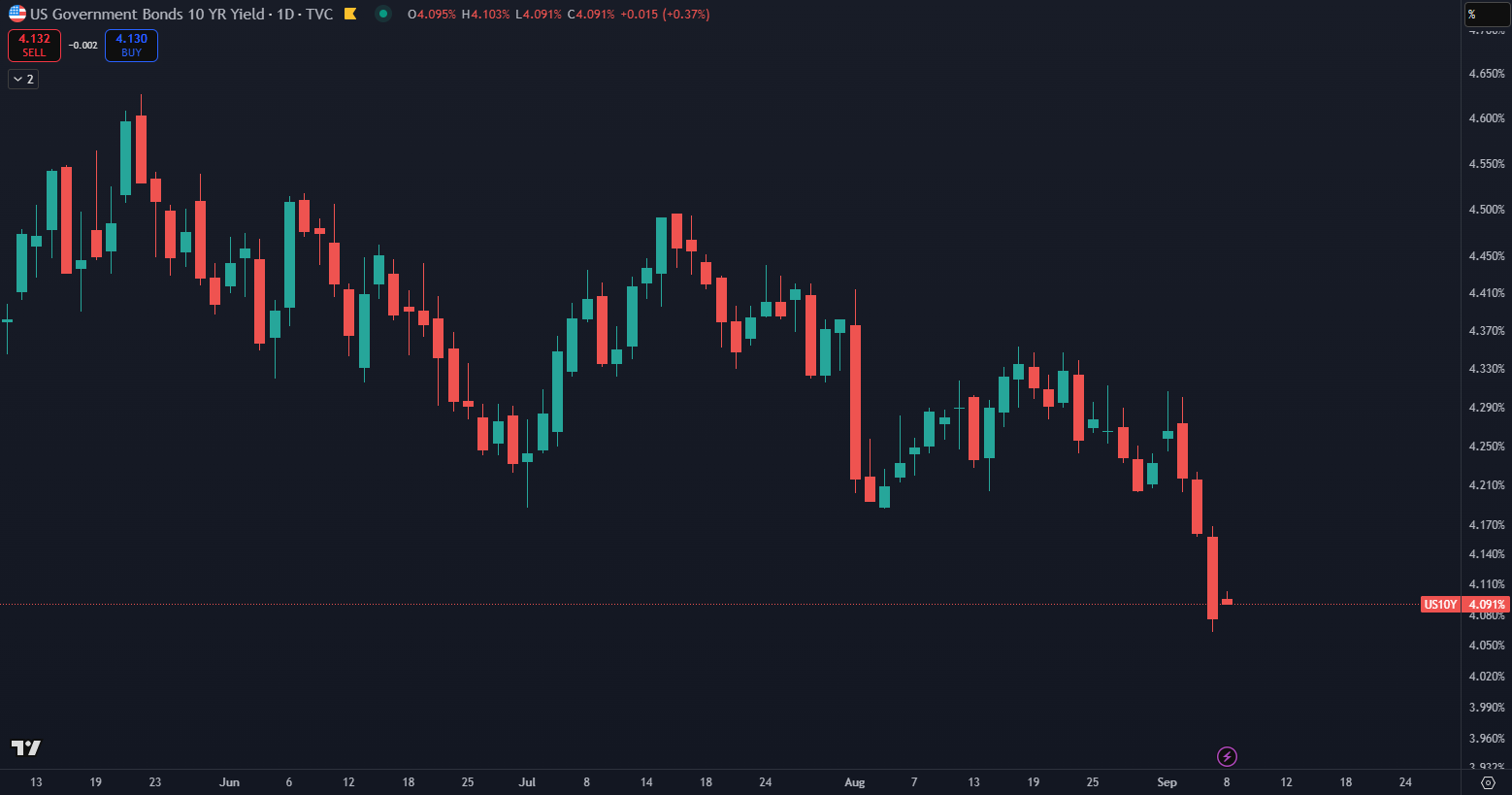 Jedným z kľúčových faktorov je pád výnosov amerických 10-ročných dlhopisov. Nižšie výnosy znižujú náklady na financovanie a zvyšujú záujem investorov o alternatívne aktíva, medzi ktoré patrí aj Bitcoin. Historicky sa v takýchto obdobiach posilnil dopyt po kryptomenách, čo môže zopakovať aj tentokrát.