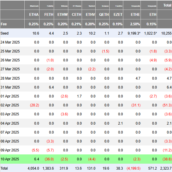Spotové ETF fondy Etherea naďalej oslabujú s viac ako 38,8 milióna dolárov čistých odlivov 10. apríla. Tieto investičné produkty zaznamenali za posledné dva týždne konzistentné odlivy, ukazujú údaje Farside.