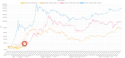 Na grafe od Bitcoin Cycles Comparison je zobrazený pohyb Bitcoinu od halvingu k halvingu. Oranžová, červená a modrá krivka predstavujú predchádzajúce cykly. Vľavo dole je žltou krivkou znázornený súčasný cyklus, keďže posledný halving bol zaznamenaný v apríli 2024. A červený kruh demonštruje, v akej fáze sa Bitcoin nachádza.