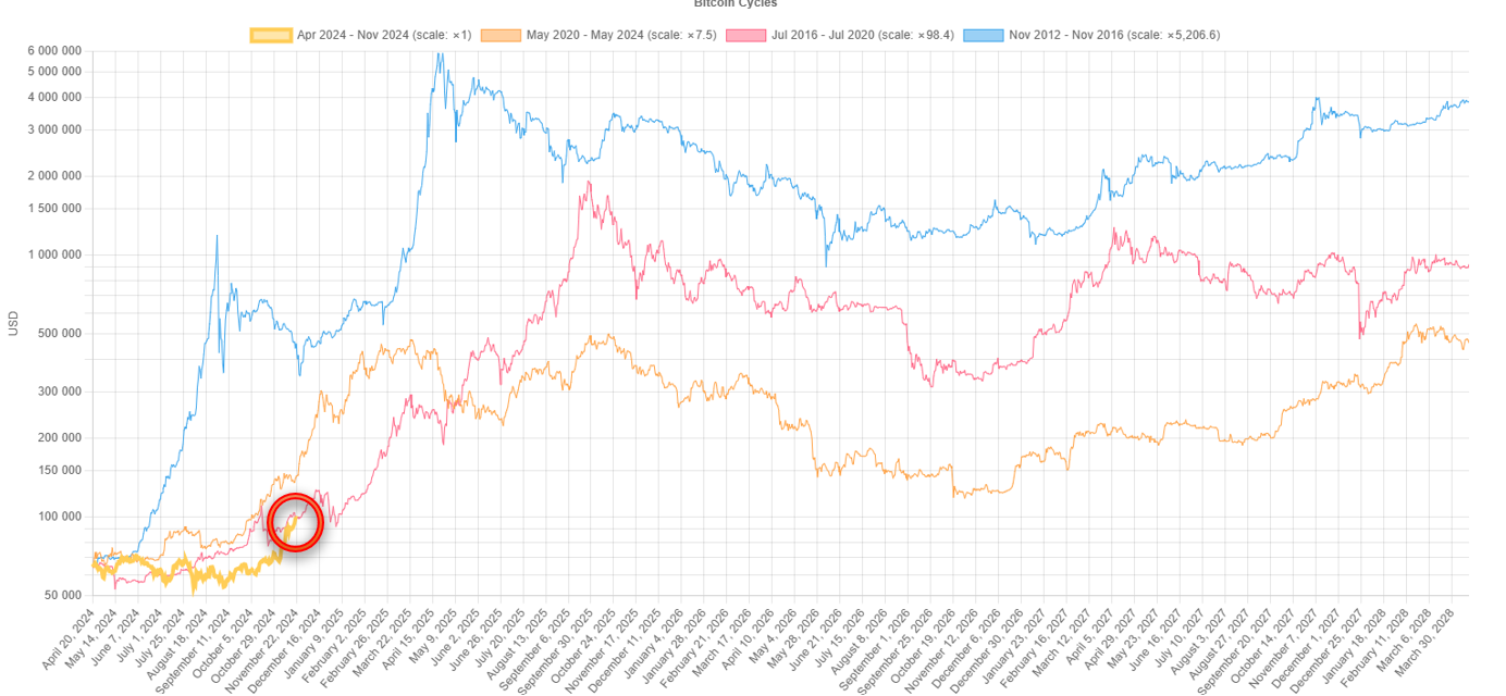 Na grafe od Bitcoin Cycles Comparison je zobrazený pohyb Bitcoinu od halvingu k halvingu. Oranžová, červená a modrá krivka predstavujú predchádzajúce cykly. Vľavo dole je žltou krivkou znázornený súčasný cyklus, keďže posledný halving bol zaznamenaný v apríli 2024. A červený kruh demonštruje, v akej fáze sa Bitcoin nachádza.