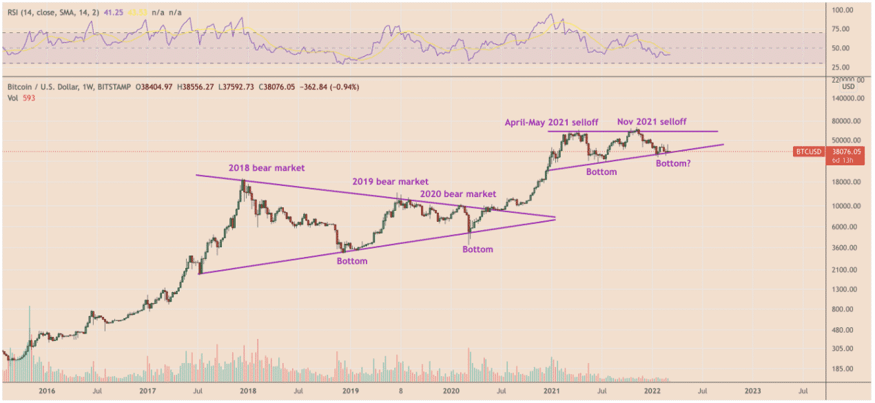 Podpora BTC na trendovej línii je v podstate technický vzor častokrát nazývaný aj ako „stúpajúci trojuholník v konjugácii”. Tento vzorec je aktívny už od decembra 2020. Spodná hranicu predstavuje úroveň akumulácie a horná hranica je oblasť distribúcie.