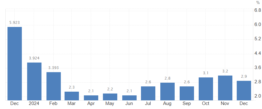 Ročná miera inflácie na Slovensku sa podľa údajov TradingEconomics v decembri 2024 znížila na 2,9 % z novembrových 3,2 %. Ide o najnižšiu mieru inflácie od septembra, čo je spôsobené pomalším rastom cien potravín a nealkoholických nápojov (2,4 % oproti 4,7 % v novembri) a alkoholických nápojov a tabaku (3,8 % oproti 4,9 %).