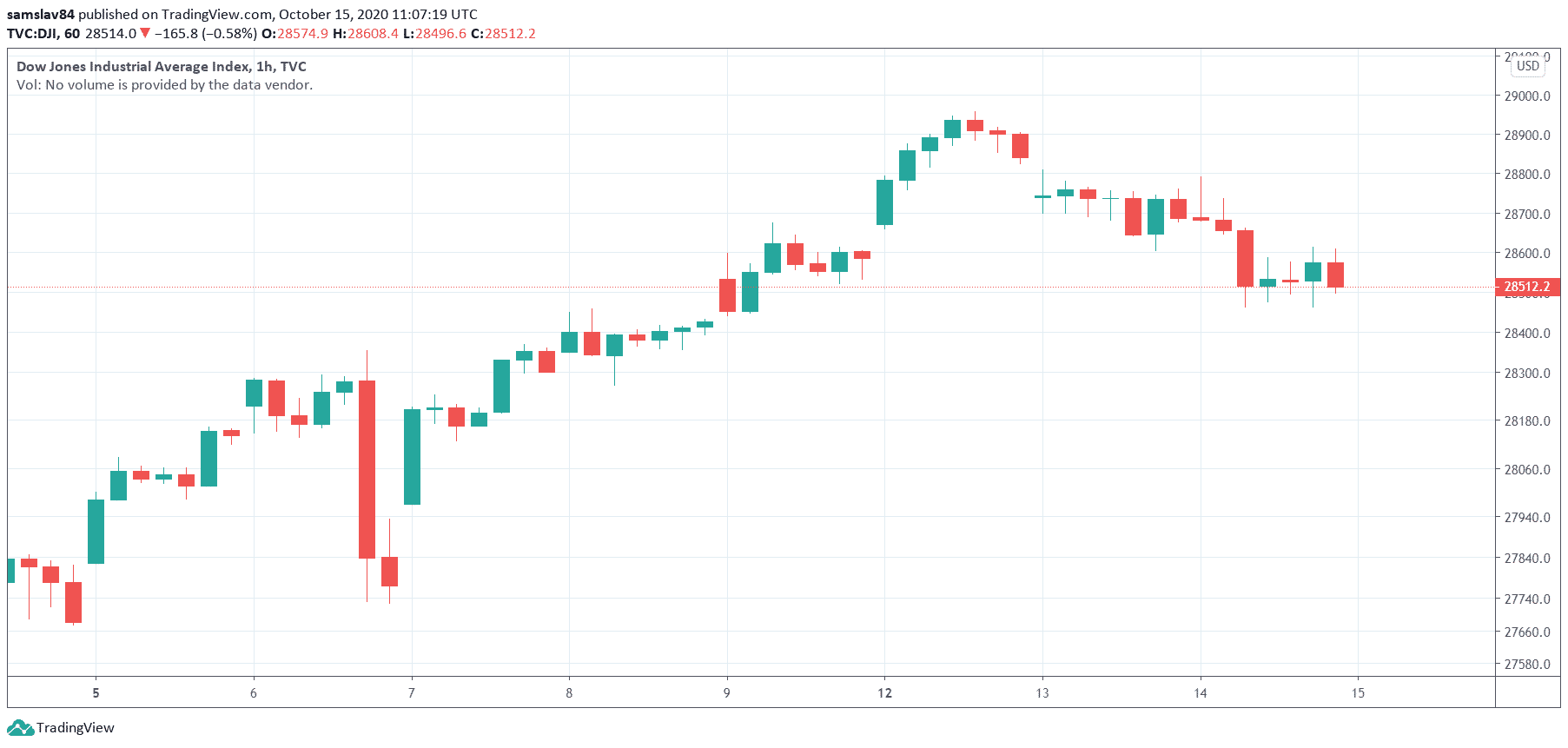 Za posledné dva dni sme zaznamenali pokles o takmer 3%. Nie je však jediný. podobné pohyby zaznamenali aj akciové indexy či vzácne kovy. Dow Jones Industrial Average tento týždeň klesá po tom, čo minulý piatok dosiahol lokálne maximum. Aktuálne už z vrchola stratil viac než 2%.