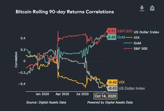 - Kolerácia Bitcoinu s akciovými indexami