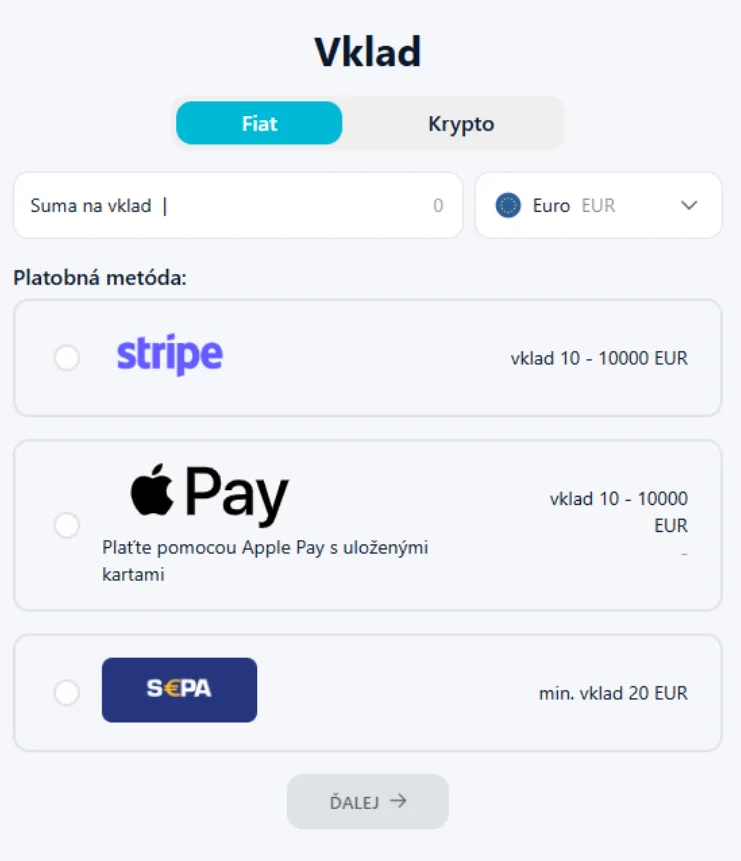 Možnosti vkladu na crypto4me. Zdroj: crypto4me.eu