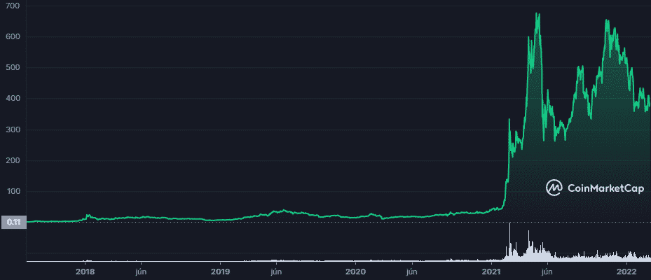Binance coin počas veľkých poklesov v roku 2018, keď väčšina kryptomien stratila 90 % svojej hodnoty, sa pohyboval na historickom maxime a najväčší výkyv bol iba 50 % . O niečo ,,horšie“ táto minca znášala roky 2019 a 2020, keď sme krátkodobo videli aj väčšie poklesy. Aj počas týchto 2 rokov minca prekonala historické maximum. V roku 2019 to bolo tesne nad 33 USD a v roku 2020 bolo maximum 40 USD. Minulý rok sa cena tejto tretej najznámejšej kryptomeny pohybovala na hodnote okolo 400 USD. Historické maximum v minulom roku bolo aj 4. rok po sebe znovu prekonané a vytvorilo sa na hodnote 672 USD. Od zalistovania na veľké burzy táto kryptomena urobila takmer 100-násobné zhodnotenie a stále rastie.