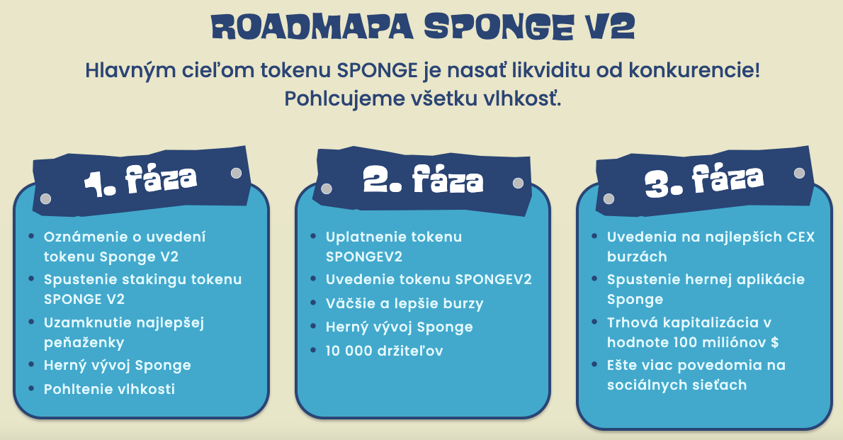 Sponge združuje nadšencov humoru a postavičiek rovnomenného seriálu a na trhu už stihol zaznamenať výrazný úspech, keď v lete 2023 presiahol tržnú kapitalizáciu 100 miliónov dolárov. Presne na túto hranicu by sa chcel projekt opäť dostať, k čomu by mu mala pomôcť nová verzia mince Sponge V2. Okrem nej Sponge pridáva aj modernizovanú formu úžitkovosti a odmien pre komunitu.