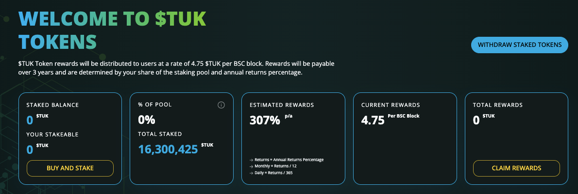 Príležitosť niekoľkonásobnej návratnosti investícií môžete využiť aj vy, keďže aktuálna cena jedného tokenu TUK je 0,02625 dolára. No a kým sa celý systém spustí, máte možnosť zakúpené tokeny stakovať s ročnou odmenou 307 %.