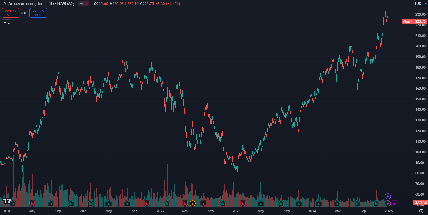 Hoci je Amazon primárne e-commerce gigantom, jeho cloudové výpočtové systémy a divízie zamerané na umelú inteligenciu zaznamenávajú v roku 2024 mimoriadne významný rast. Analytici z popredných finančných inštitúcií predpokladajú, že tento pozitívny trend bude pokračovať aj v nasledujúcom roku. Spoločnosť dosiahla v tomto roku pozoruhodný nárast hodnoty akcií o 50,95 % na úroveň 226,33 dolárov, ukazujú údaje TradingView.