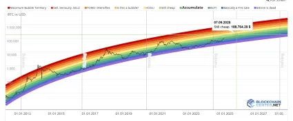 Z hľadiska ceny sme nespomenuli 190 000 dolárov len tak náhodou. Tento scenár je totiž zrejme najviac realistický zo všetkých a je podporený historickými cyklami. Už skôr sme vás informovali, že v roku 2025 by sa mohla cena na základe dúhového grafu od Blockchaincenter vyšplhať až na 190 000 dolárov.
