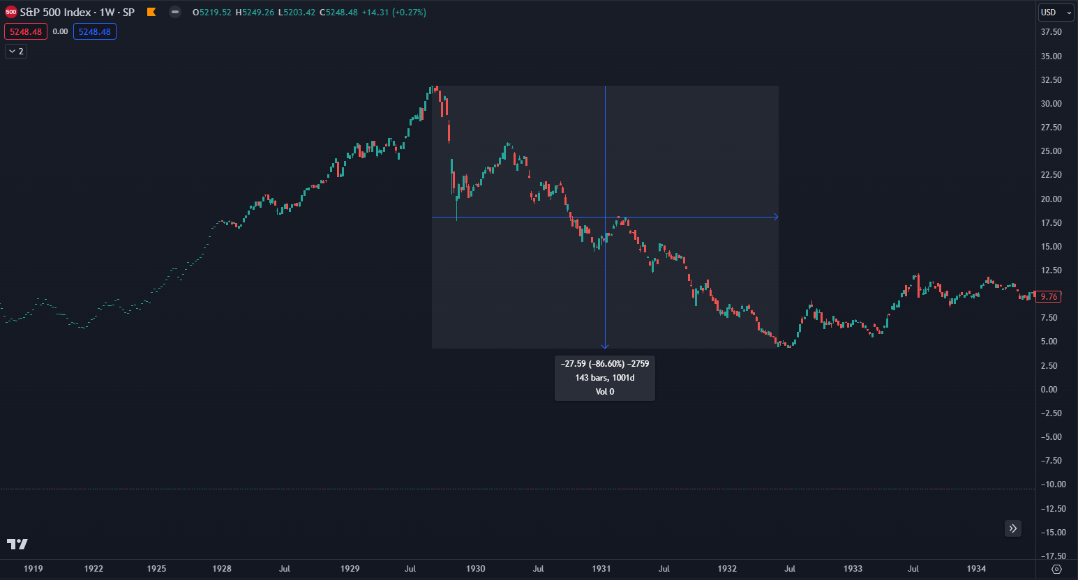 Za najväčší pád akcií v histórii možno bezpochyby považovať práve krach na Wall Street z roku 1929, ktorý následne spustil Veľkú hospodársku krízu. Akciový index S&P 500 klesol v čase od septembra 1929 do júna 1932 až o neskutočných 87 %. Pád akcií náhle vymazal celý úspech predchádzajúceho desaťročia, počas ktorého trhy prekvitali.