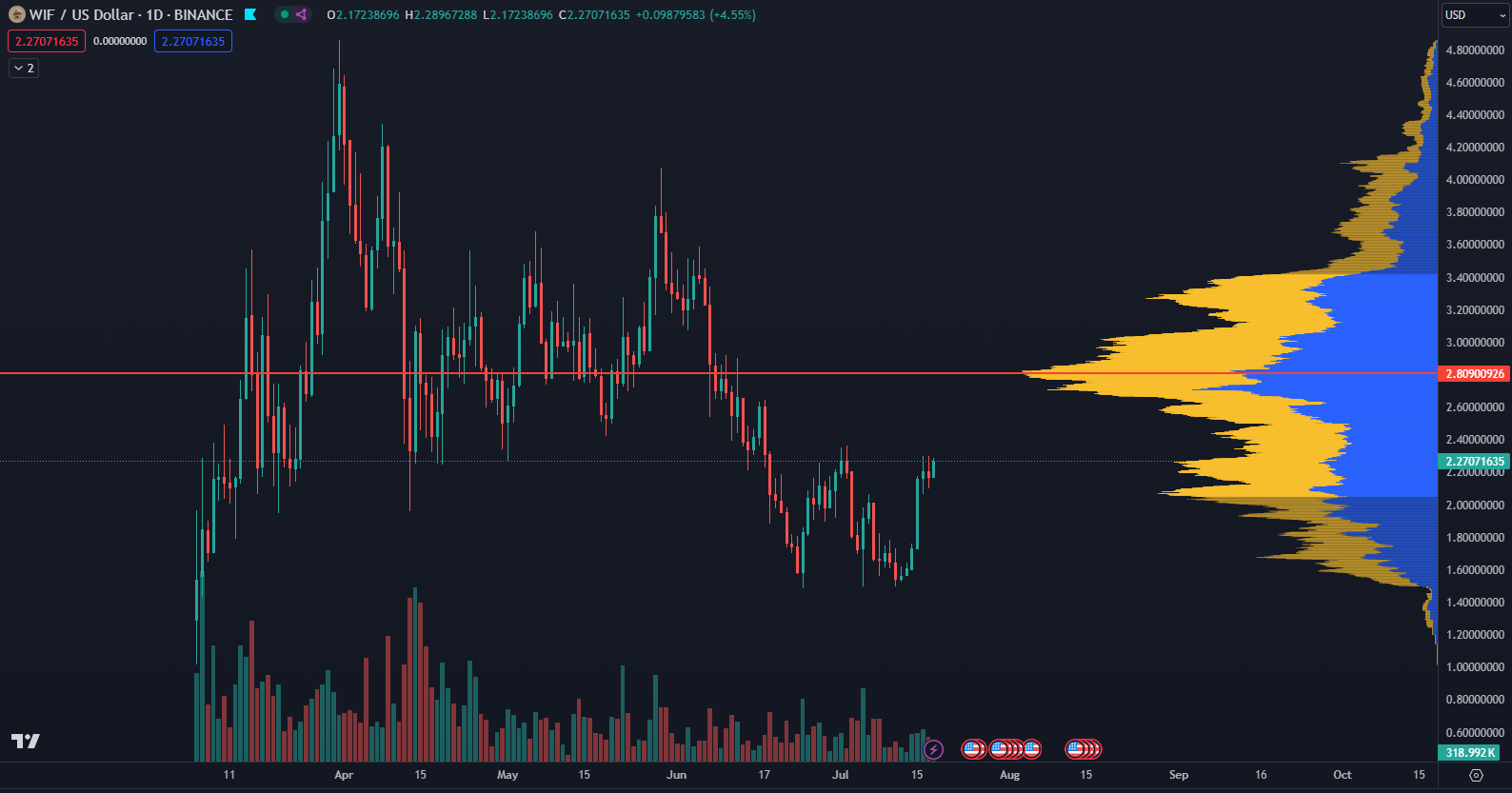 Cena WIF zaznamenala podobný vzostup už začiatkom júla. Následne vytvorila korekciu a opäť rastie. Tomuto rastu však predchádzala korekcia o sile až 70 %. Napriek silným korekciám si meme coiny držia vyššiu ziskovosť ako zvyšok trhu.