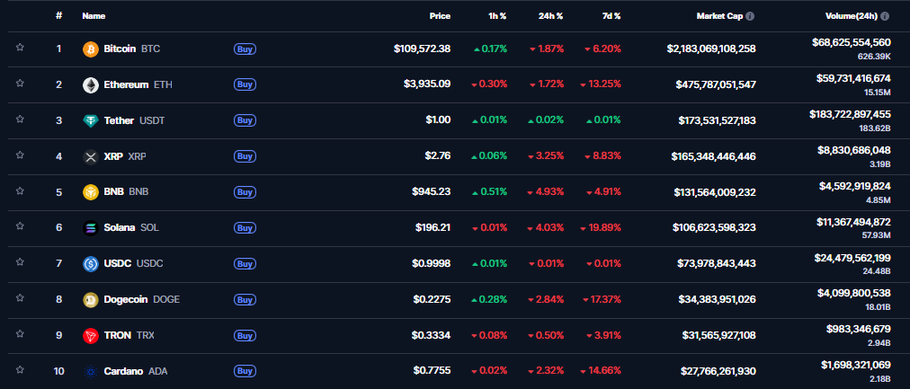 Odporúča sa investovať do top 10 kryptomien. Zdroj: coinmarketcap.com
