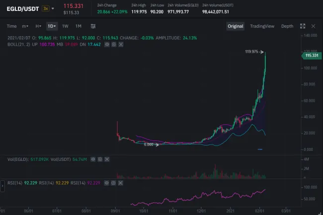 Elrond (EGLD) behom posledných 2 týždňov stúpol o 350%, z 36 USD, na takmer 120 USD v čase písania článku. Za posledné 4 dni sa tento rast ešte zrýchlil, kedy cena vyletela z 66 USD už na spomínaných 120 USD v čase písania článku.