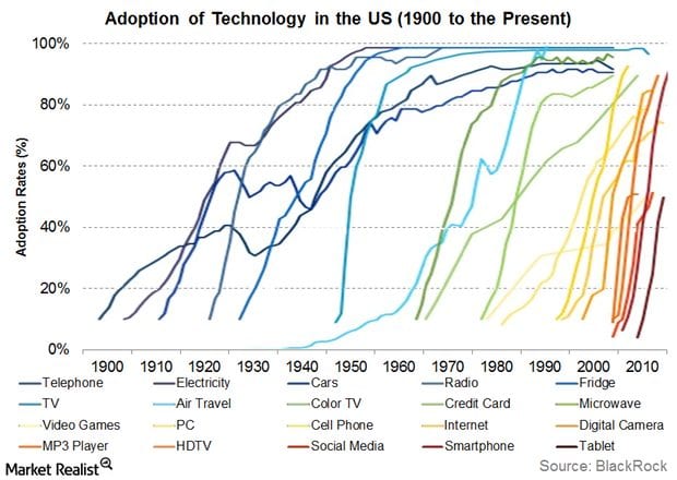Ako každá nová technológia, Bitcoin potrebuje nejaký čas na prípravu, kým bude schopný fungovať ako platobná metóda na každodennej báze. Hlavné zmeny musia nastať v cene transakcií, ich rýchlosti a miere súkromia. Čo sa týka ale následnej adopcie, tak pokiaľ sa pozrieme na nasledujúci obrázok, vidíme, že začlenenie daného návyku alebo technológie trvá čím ďalej kratšie. Obzvlášť pokiaľ vezmeme do úvahy, že kľúčová časť adopcie kryptomien – teda Internet – je už nevyhnutnou súčasťou našich životov a je takmer všade.