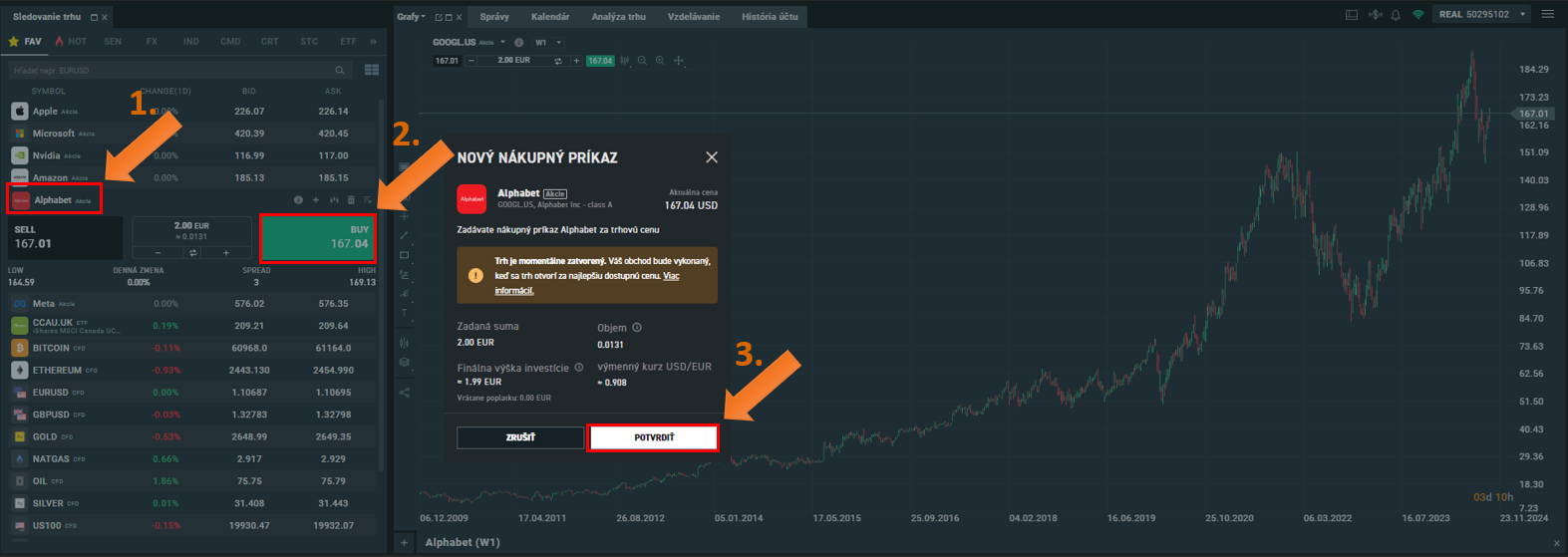 Hlavnými produktami sú Gmail, Google Maps, YouTube alebo Google Chrome. Google cloud síce zatiaľ zaostáva za AWS od Amazonu z hľadiska príjmov, no je na vzostupe. Výrazné zvýšenie investícií do oblasti cloudu môže podporiť aj cenový rast akcií na najbližšie roky. Akcie GOOGL stúpli za posledné dva roky o 75 %. Na obrázku nižšie môžete vidieť, ako jednoducho viete tieto akcie nakúpiť na XTB.