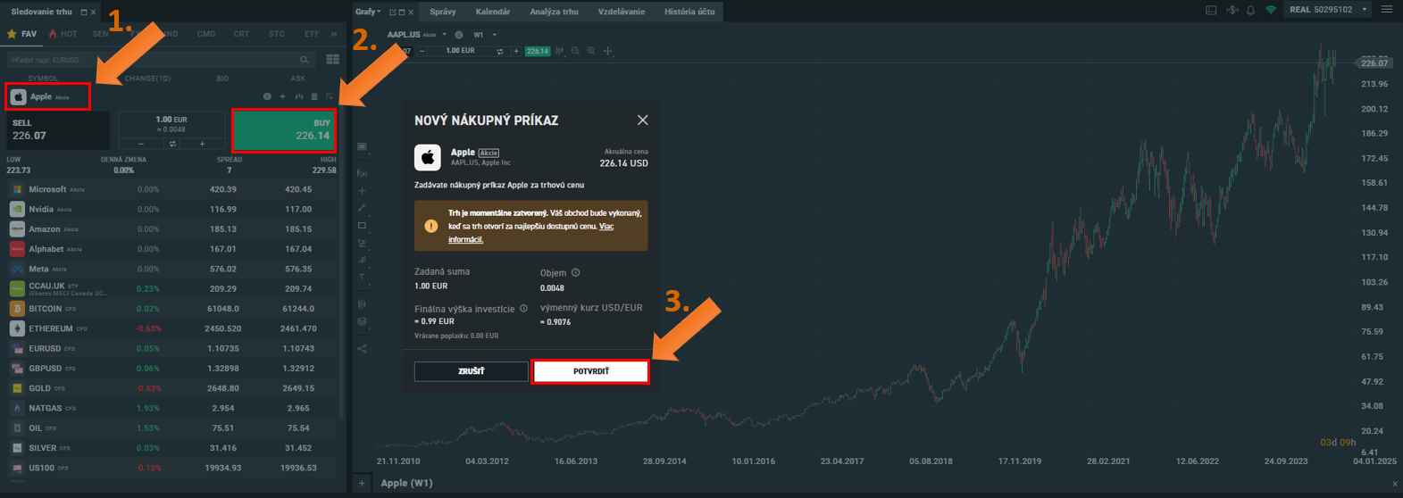 Spoločnosť posledné roky výrazne investovala do pridružených služieb ako Apple Music, Apple TV+, iCloud a App Store, z ktorých taktiež čerpá značné príjmy. Akcie APPL stúpli za posledné dva roky 68 % a dlhodobo rastú. Na obrázku nižšie môžete vidieť, ako jednoducho troma klikmi viete akcie APPL nakúpiť na XTB.