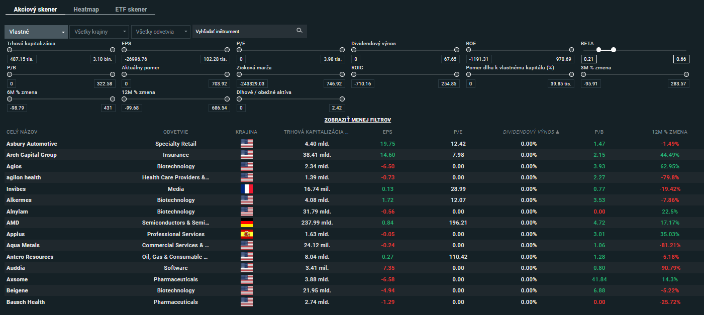 XTB ponúka mnoho filtrov, podľa ktorých môžete diverzifikovať akciové portfólio. Viete filtrovať napríklad podľa geografie, ako vidíte na obrázku nižšie, no taktiež podľa odvetvia, ziskovej marže a ďalších parametrov.