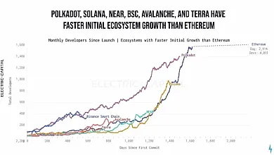 Druhý najrýchlejší vývojársky rast Polkadotu v sektore kryptomien. Zdroj: https://decrypt.co/89812/solana-terra-polkadot-growing-faster-ethereum-report