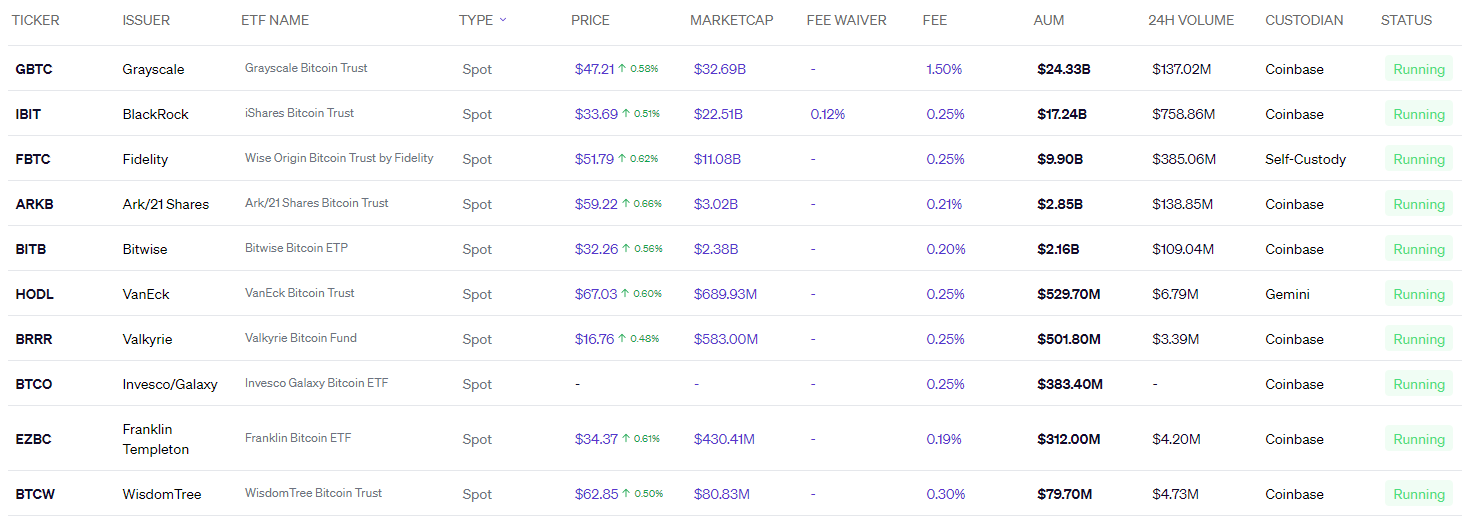 V tabuľke nižšie, podľa údajov Blockworks, je zobrazený zoznam aktuálnych spotových ETF pre Bitcoin. Môžete vidieť, že ich hodnota dosahuje desiatky miliárd dolárov a sú pod správou najväčších správcov aktív na svete, čo poskytuje určitú dávku istoty a legitimity.