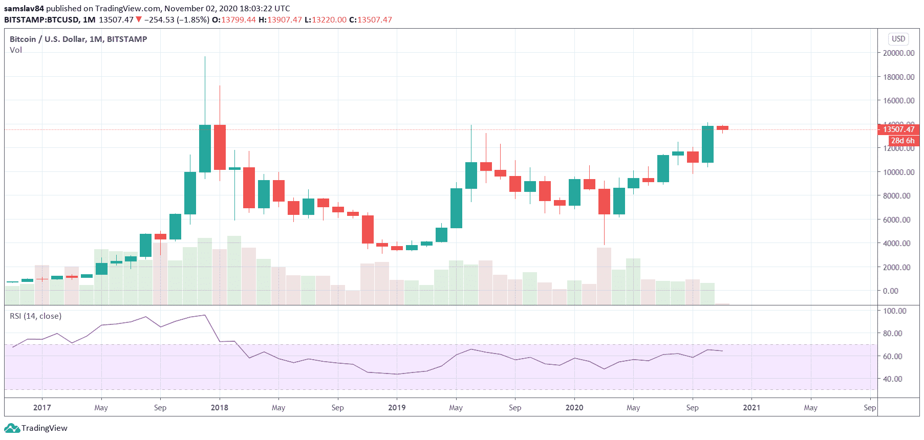 Z histórie vieme, že vždy keď bol Bitcoin blízko dlhodobého historického maxima, ľudia sa oň zaujímali podstatne viac, než obyčajne. Mesiac október síce uzavrel na cene 13 850 $, čo nás, kryptomenových nadšencov ohromilo, no bežní ľudia zatiaľ veľmi nejavia záujem. Aj preto je málo pravdepodobné, čo toto je ten veľký finiš a ak sa nestane niečo naozaj strašné, Bitcoin bude pokračovať smerom hore.