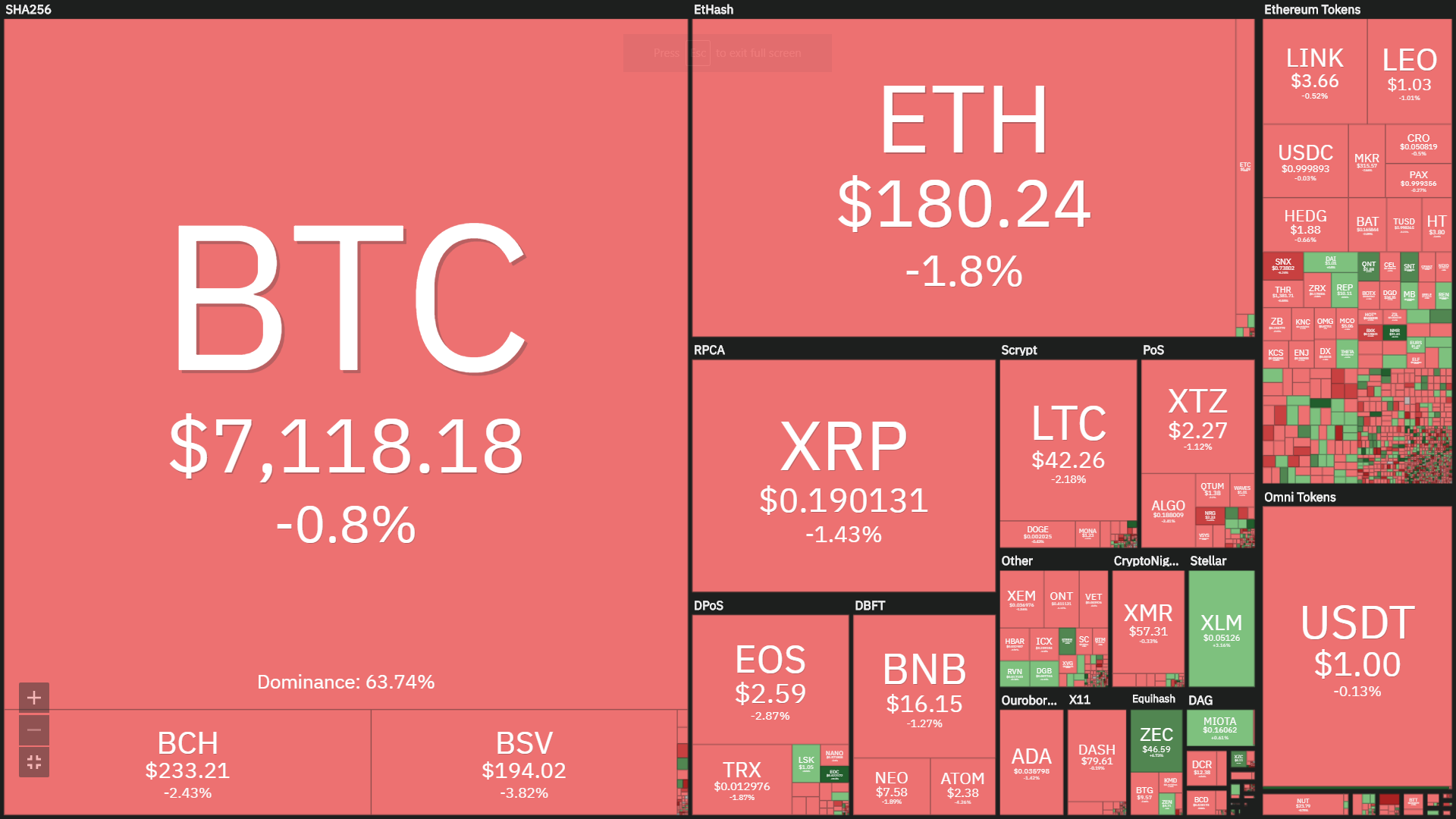 Bitcoin sa v nedeľu nakoniec udržal nad hladinou 7000 $ a vytvoril tak piatu zelenú weekly sviecu v rade s close cenou ~7120 $. Komodity medzičasom zaznamenali pokles a ropa padla pod 15 $ za barel. Trh s kryptomenami čaká náročný týždeň. Pravdepodobnosť korekcie sa neustále zvyšuje.