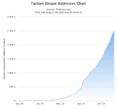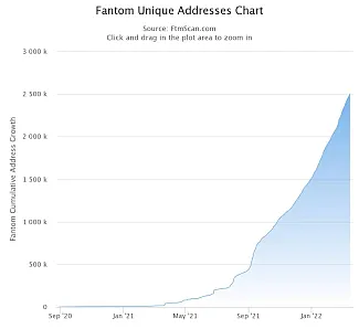 Unikátne FTM adresy. Kryptomena FTM je v súčasnosti v korekcii, no zoznam aktívnych peňaženiek rastie, čo je signál aktivity a možného budúceho rastu. Zdroj httpsftmscan.comchartaddress
