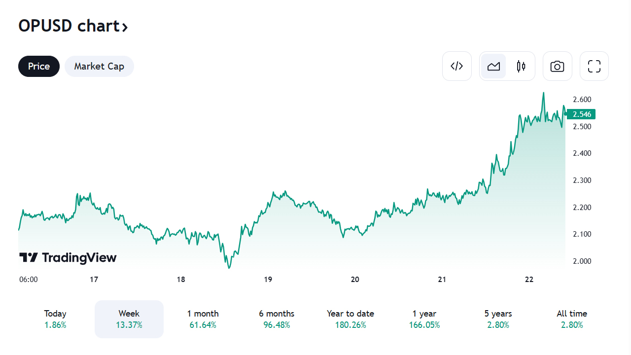 Optimism vykazuje známky oživenia na trhu s kryptomenami, pričom došlo k výraznému nárastu sieťových transakcií a držby veľkými investormi. Významným faktorom tohto pozitívneho trendu bol upgrade siete Bedrock, ktorý prispel k 67% nárastu transakcií.