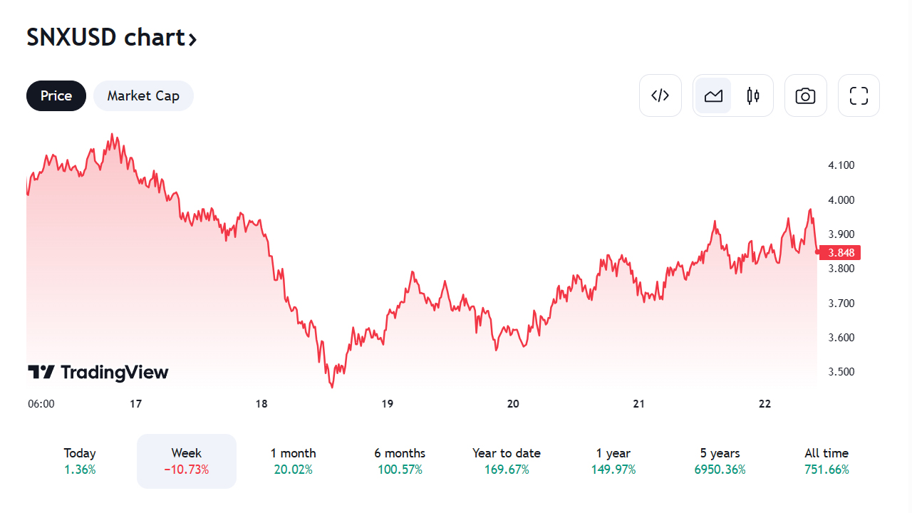 Cena Synthetix bola pod tlakom v dôsledku celkového poklesu trhu. Napriek tomu preukázal odolnosť a udržal si úroveň záujmu a aktivity v rámci priestoru DeFi.
