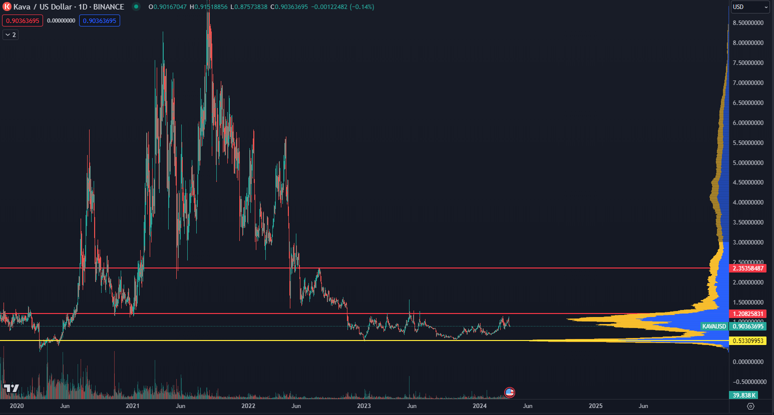 Token KAVA sa opäť nachádza v akumulačnej zóne, po ktorej by mal nastať prudký cenový rast. Sledujeme cenové ciele na úrovni 1,20 a 2,35 dolárov, pričom trhová cena je v čase písania na hodnote 0,90 dolárov. Trhová kapitalizácia kryptomeny sa pohybuje tesne pod 1 miliardou dolárov.