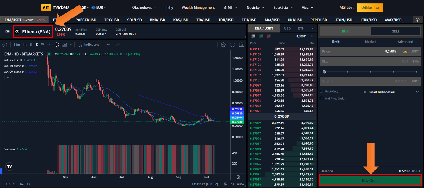 Cena ENA má za sebou hlbokú korekciu, no od polovice septembra sa trh úspešne vyšplhal na nové maximá. Posledné dva týždne sme boli svedkami znehodnotenia, čo poskytuje príležitosť na lacnejšiu kúpu kryptomeny. Nа obrázku vyššie môžete vidieť, ako jednoducho viete nakúpiť ENA na burze BITmarkets.