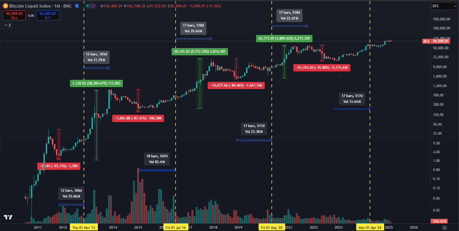 V roku 2025 sa očakáva, že trh s kryptomenami bude rásť na základe halvingových cyklov Bitcoinu (žlté čiary). Zároveň je vysoká pravdepodobnosť, že práve v tomto roku budeme svedkami vrcholu dlhodobého rastúceho cyklu. Takže ak plánujete zhodnotiť svoj kapitál, práve teraz je ten správny čas implementovať jednu z nasledujúcich stratégií.