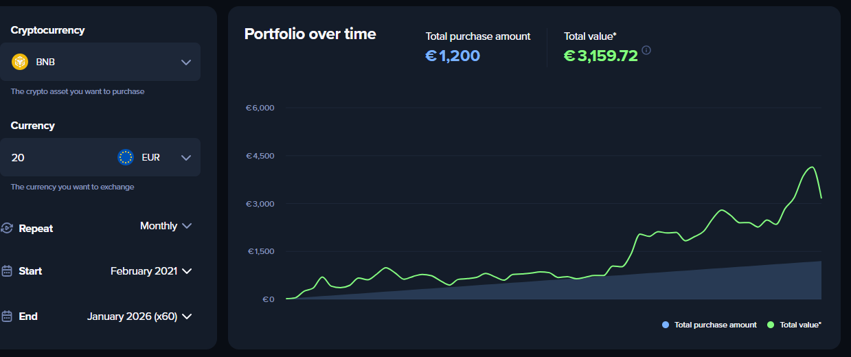 BNB dostával polovičnú mesačnú čiastku, teda 20 eur. Za 60 mesiacov to bolo celkovo 1 200 eur vloženého kapitálu. Výsledná hodnota ku koncu januára 2026 dosiahla 3 159,72 €. Zisk tak predstavoval 1 959,72 eur, čo v percentuálnom vyjadrení znamená návratnosť takmer 163 %, najvyššiu zo všetkých troch aktív v portfóliu. BNB ako natívny token burzy Binance preukázal silnú výkonnosť najmä v období 2023–2025, keď jeho cena výrazne rástla.