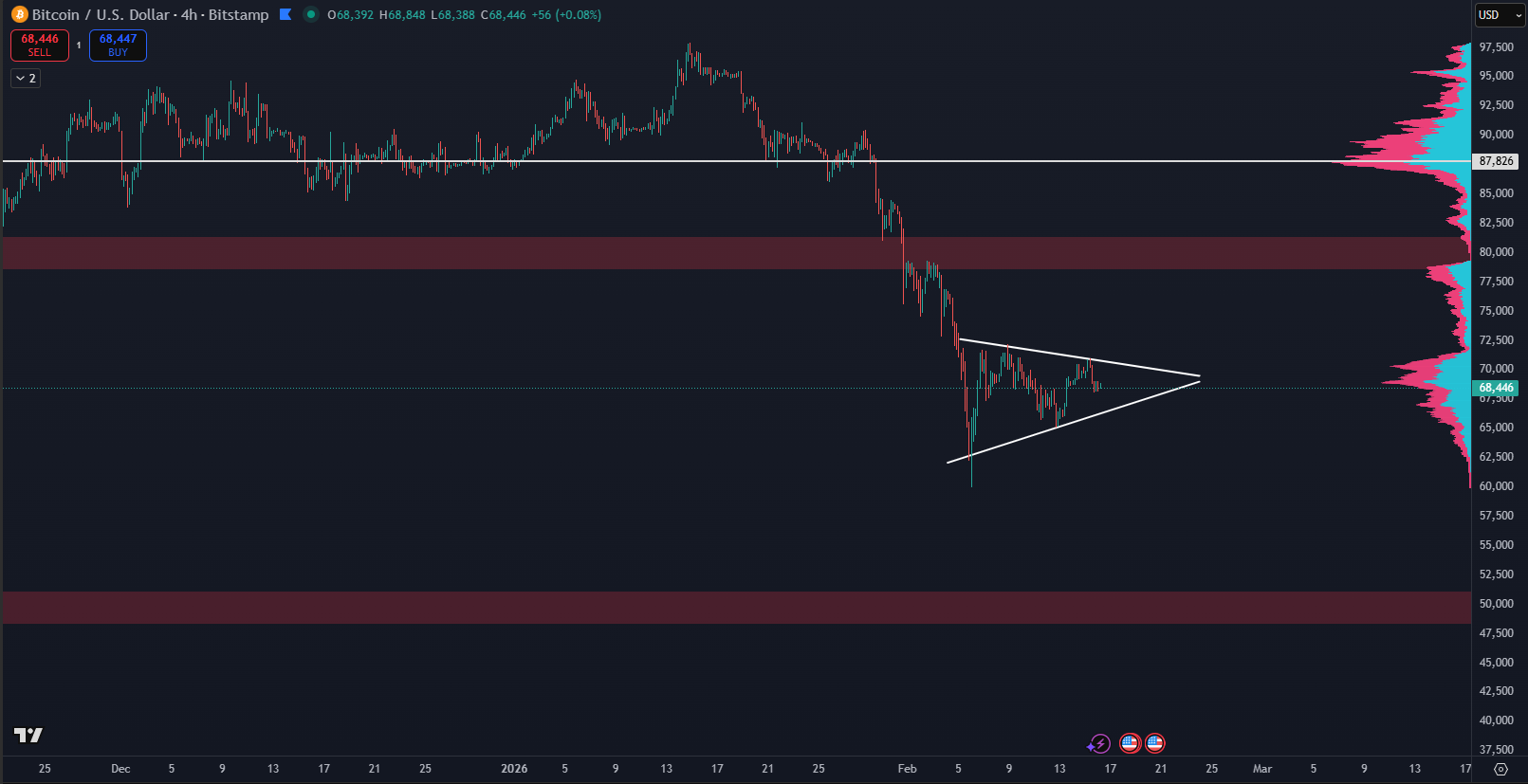 Bitcoin aktuálne kopíruje scenár z obdobia november 2025 až január 2026. Cena vytvára rastúce minimá a zároveň klesajúce maximá, čo znamená zužovanie cenového rozpätia. Takáto formácia často vedie k prudkému pohybu jedným smerom, keď trh konečne prerazí hranice konsolidácie.