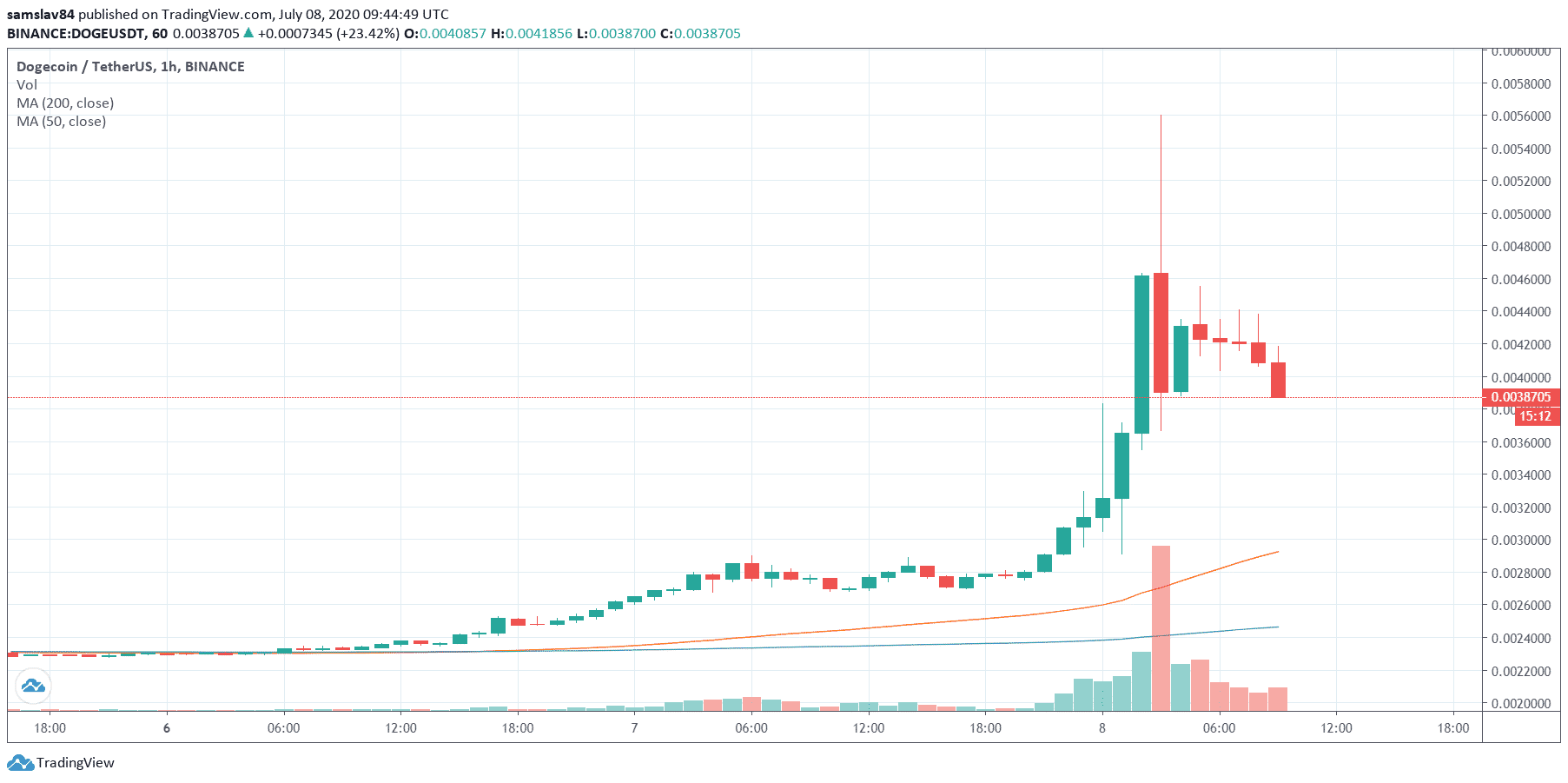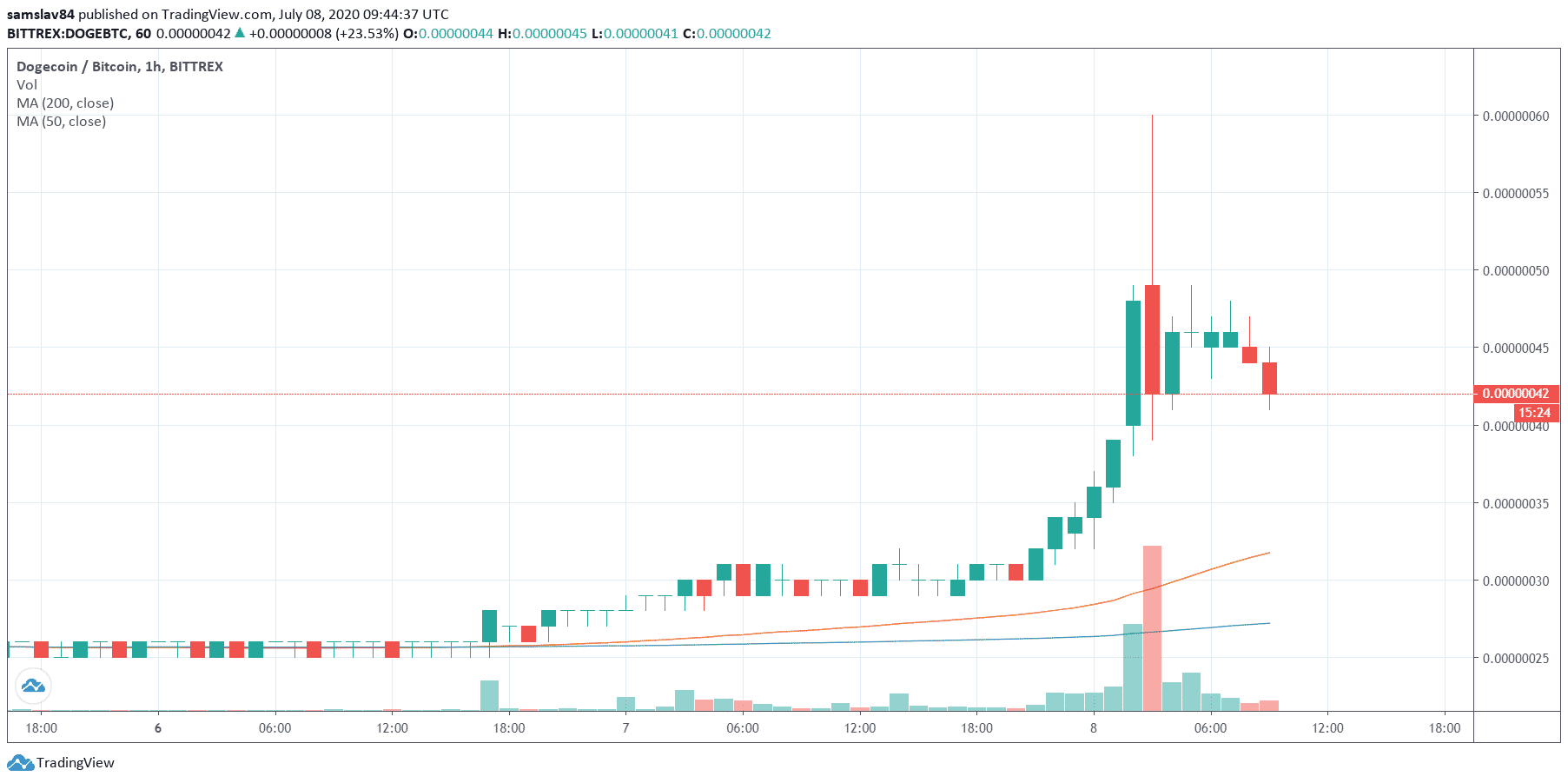 Cena Dogecoinu sa teraz pohybuje okolo 42 satoshi alebo 0,0038 $. Volume tejto kryptomeny dnes vyskočilo na dvadsaťnásobok.