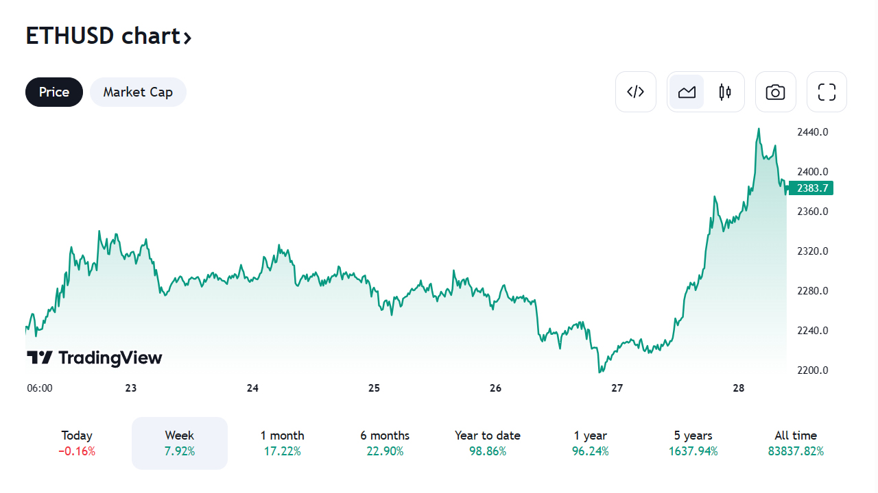 Cena Etherea zaznamenala určitú volatilitu, pričom z vrcholu v roku 2023 sa výrazne stiahla. Fundamenty Etherea, vrátane jeho modernizácie siete a potenciálneho schválenia ETF, však poskytujú solídny základ pre jeho hodnotu.